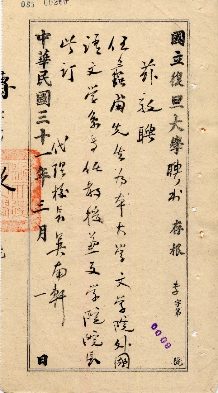 伍蠡甫教授担任文学院院长的聘书