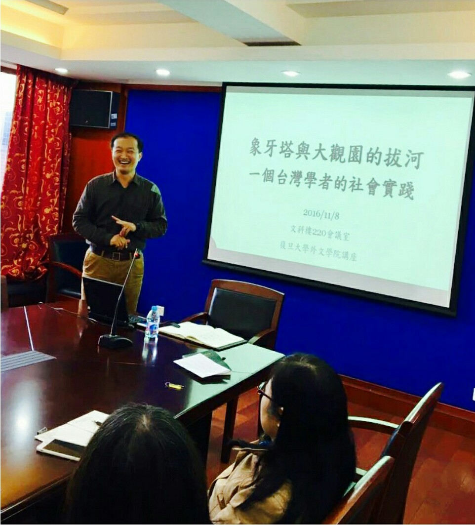 2016年11月8日,台湾东吴大学英文系教授、复旦大学外文学院访问学者曾泰元老师应外文学院青联会邀请,作了题为“象牙塔与大观园的拔河:一个台湾学者的社会实践”的讲座,和在场的教师与同学分享自己的学术成长经历,并和大家一起交流学术生活和社会实践方面的心得体会,讲座生动幽默,讨论热烈有趣。