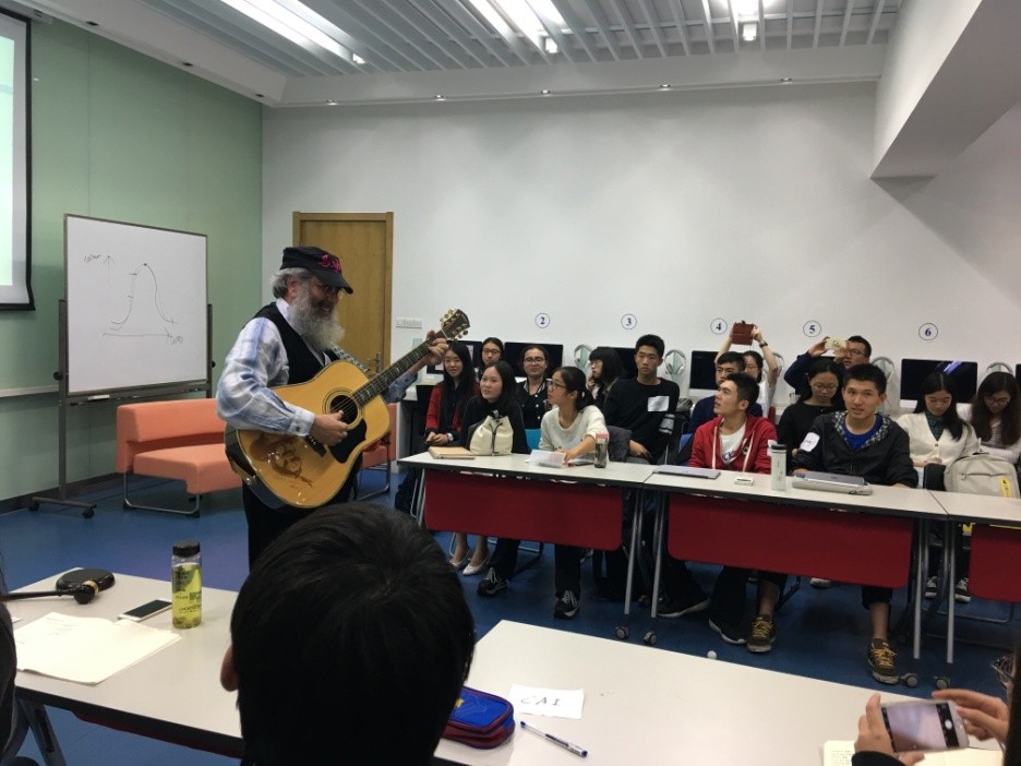 10月26日,Mark Levine博士在题为“两本书的故事”的演讲中,通过自己对Edgar Snow的Red Star Over China和Israel Epstein的 My China Eye: Memoirs of a Jew and a Journalist两本书的独特阅读体验,讲述了自己与中国的独特渊源,也可以说,正是这两本书让他产生了来到中国、去了解真实中国的愿望。临近尾声,Levine博士深情弹唱起了原创歌曲:Their Victory Was Also His Reward与The Bell Of Truth He Tolled,让全场气氛达到整晚最高潮的同时,也表达了他对这两位伟大的时代先驱的敬意。