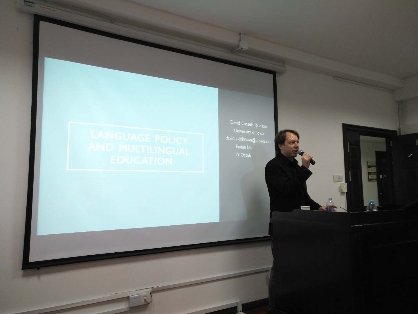 2017年10月19日,复旦大学“多语能力发展与第二外语习得研究”创新团队邀请爱荷华大学副教授David Cassels Johnson博士在文科楼543会议室做题为“语言政策与多语教育”的讲座。讲座由多语发展创新团队带头人、复旦大学外文学院郑咏滟副教授主持。会场座无虚席。
