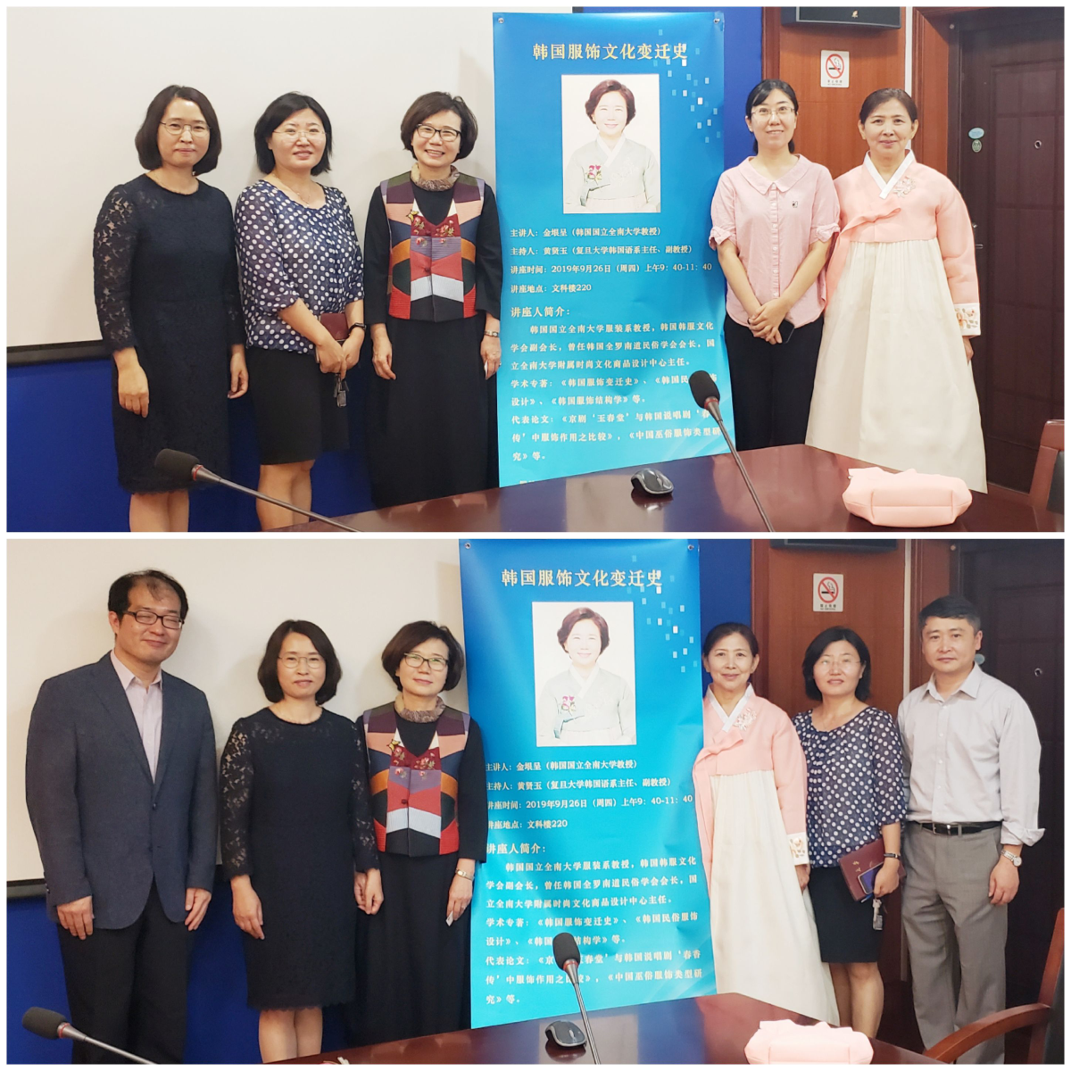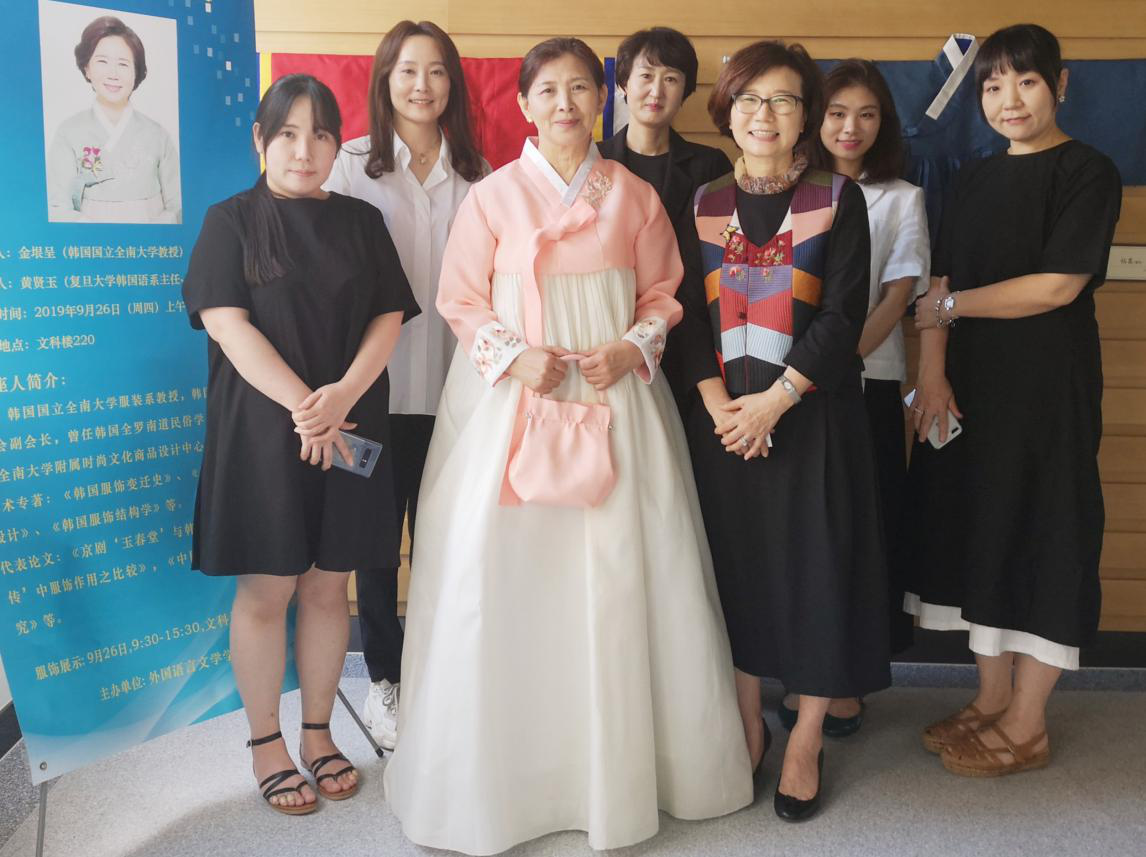 2019年9月26日,韩国国立全南大学教授金垠呈应邀前来复旦大学外文学院做了主题为“韩国服饰文化变迁史”的讲座,随行的五名博士生准备了精美的韩国服饰展,展示了韩国各历史时期的服装,从而让学生们更加近距离的接触了解韩服、体验韩国文化。