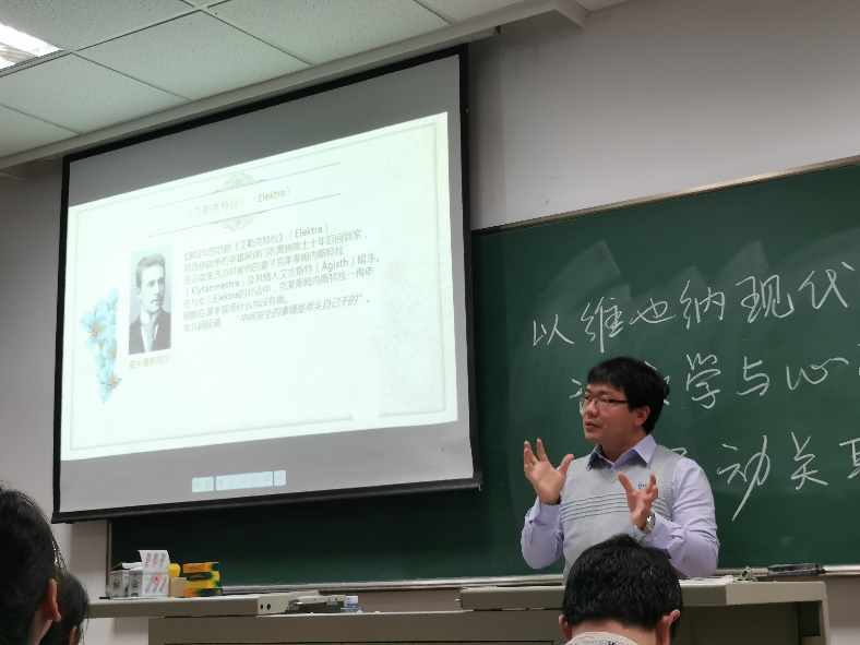讲座主要分析了弗洛伊德的心理学和以施尼茨勒和霍夫曼斯塔尔为代表的维也纳现代派文学之间的关联。刘永强老师从施尼茨勒的心理式写作、“俄狄浦斯情结”的文学来源、“歇斯底里”的文学反馈、文学与科学对话(知识诗学)这四大方面展开,通过解释“内心独白”、“俄狄浦斯情结”、“歇斯底里症”等名词的具体概念,分析《儿子》、《古斯特尔少尉》和《艾勒克特拉》三篇具体文本,并将弗洛伊德精神分析的理论与方法穿插其中,将文学创作与心理学理论隐秘的不谋而合之处及其逻辑关系展现在我们面前。