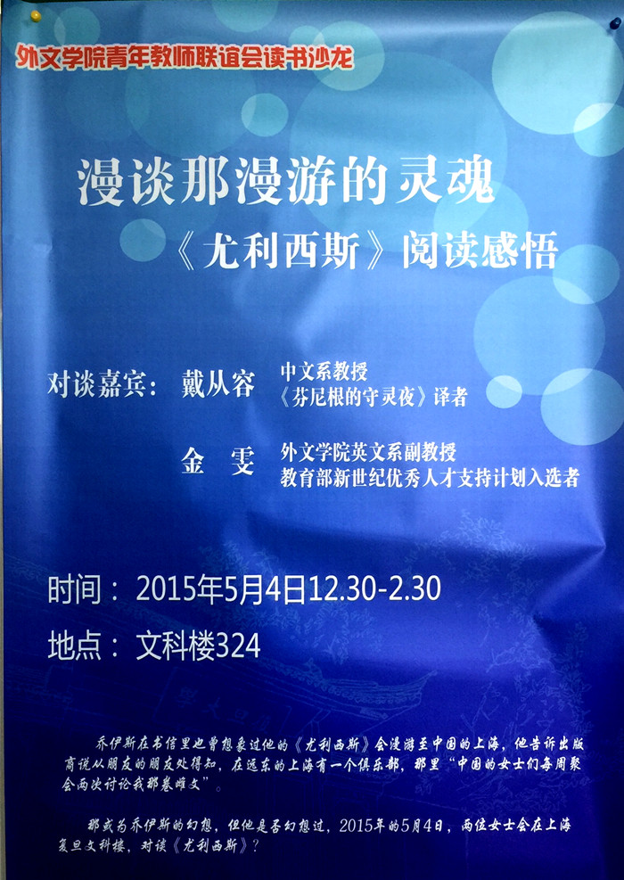 乔伊斯曾幻想他的《尤利西斯》会让中国上海的女士们“每周聚会两次,进行讨论”。但他也许绝对不会想到,今天两位中国一流女研究者在上海的一所名校里分享她们对《尤利西斯》的研究成果,而且听众中还有不少男士!青联会的此次活动,是对这位文学大师的一次特别的纪念。