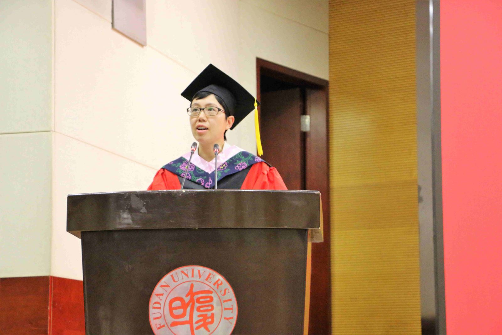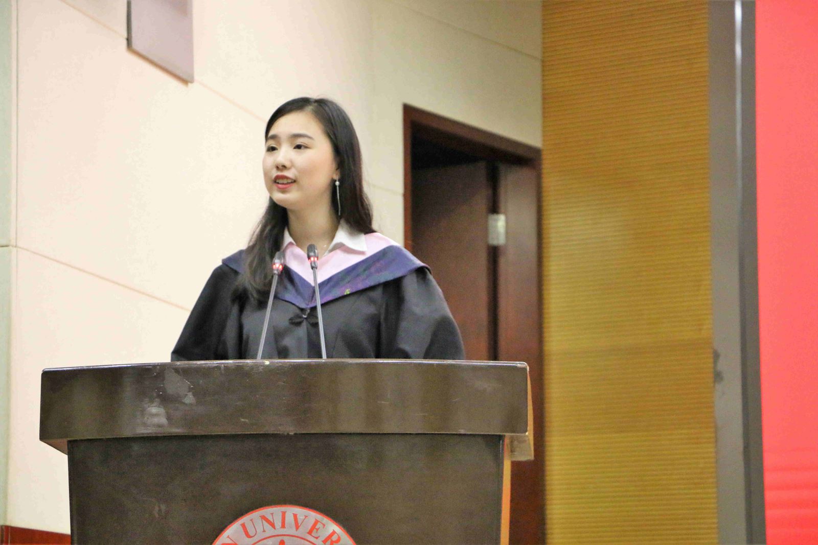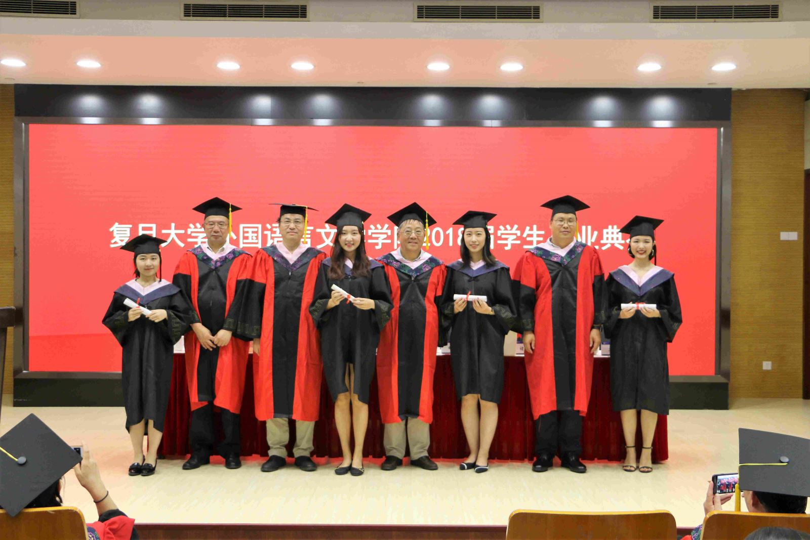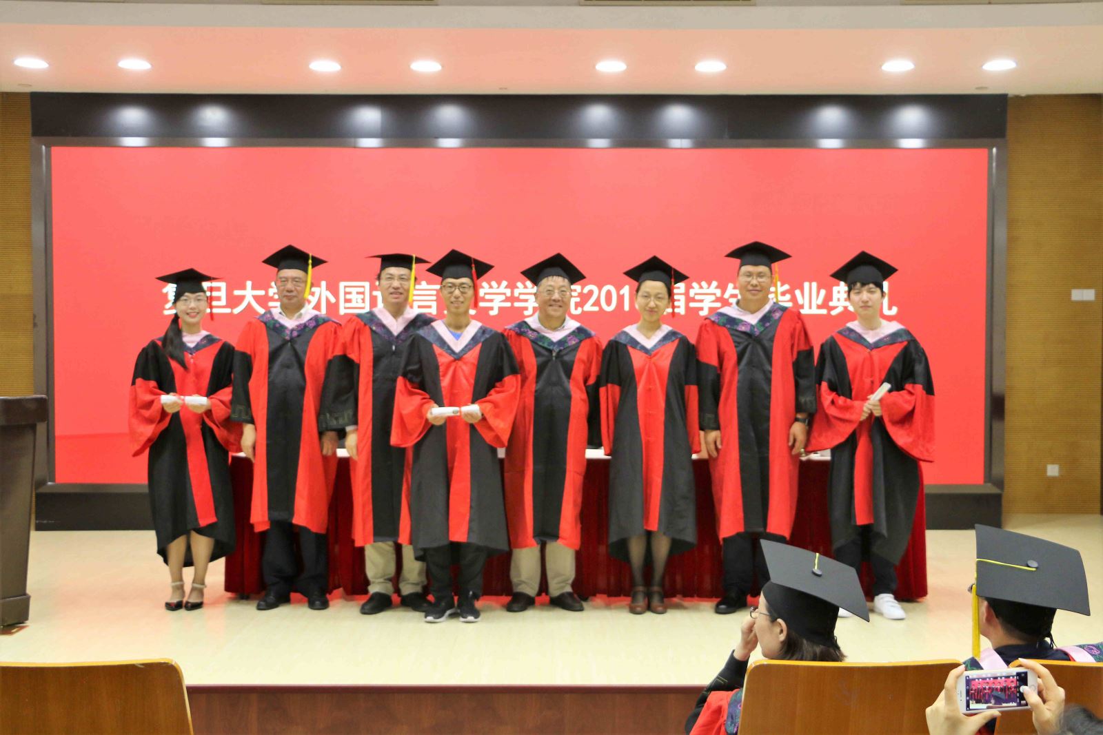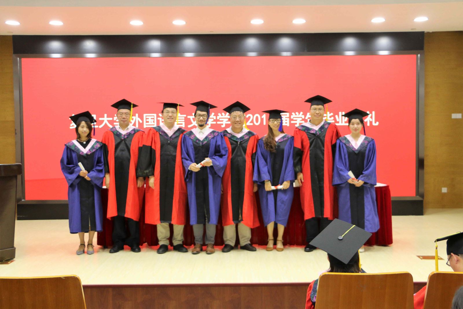 学位授予仪式上,英文系副系主任段枫老师、俄文系系主任姜宏老师、德文系李双志老师、法文系系主任袁莉老师、日文系系主任邹波老师、韩文系系主任黄贤玉老师、翻译系系主任汪洪章老师先后上台宣读毕业生名单。