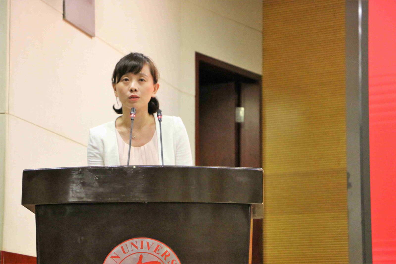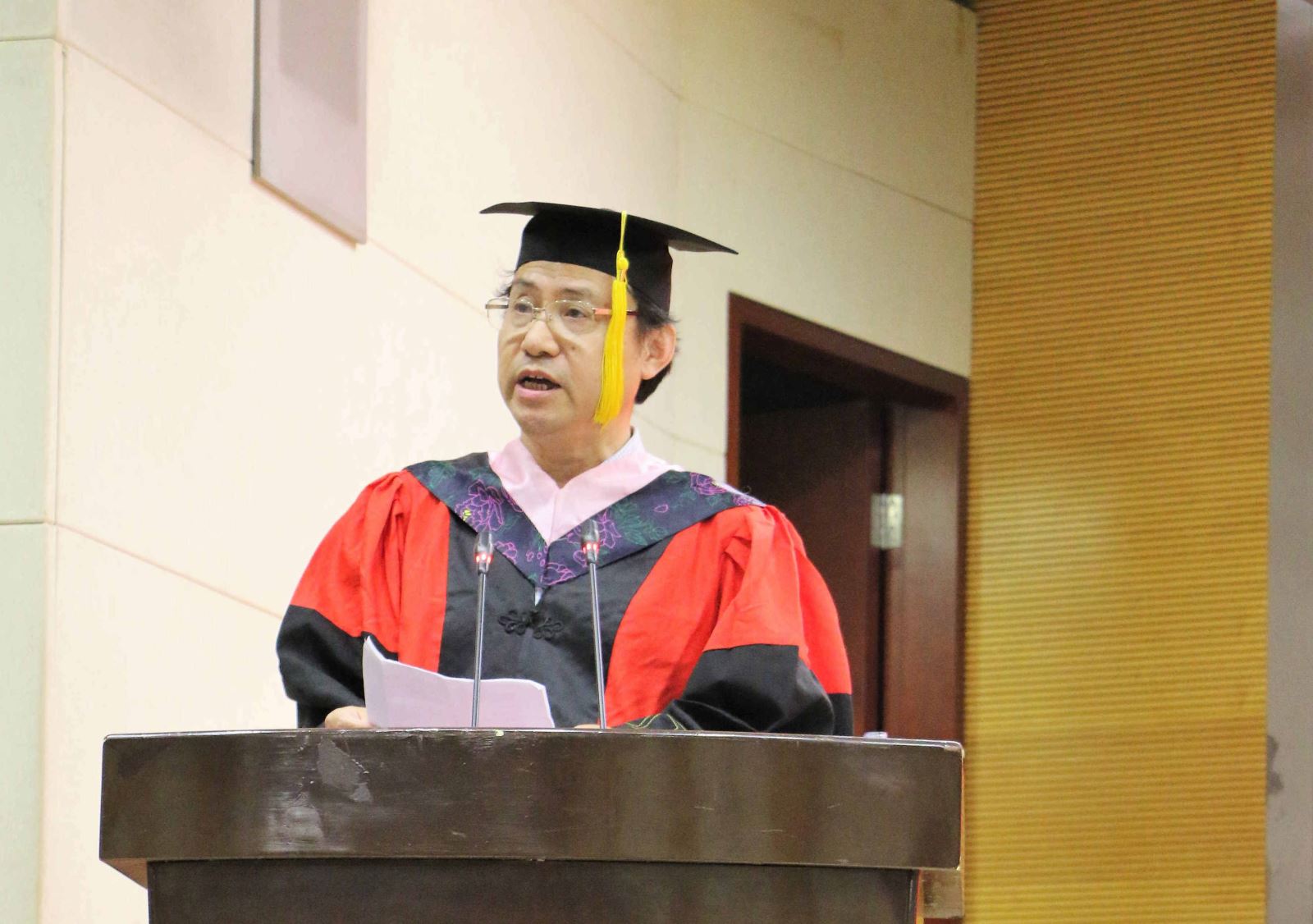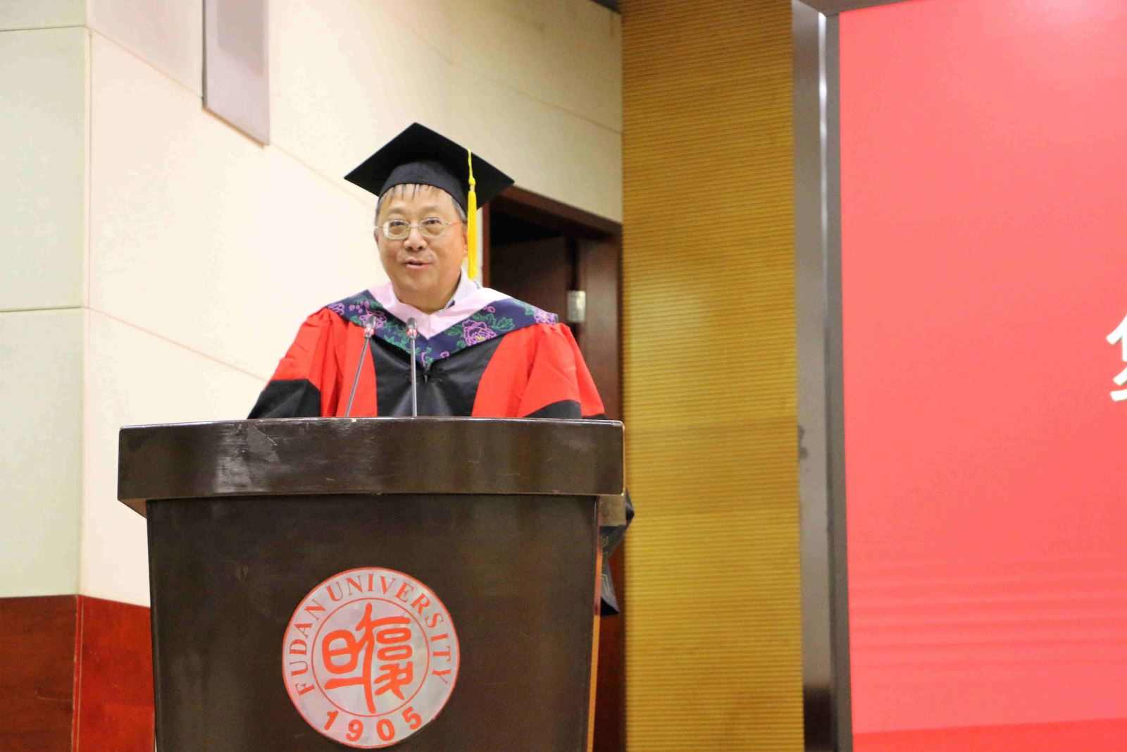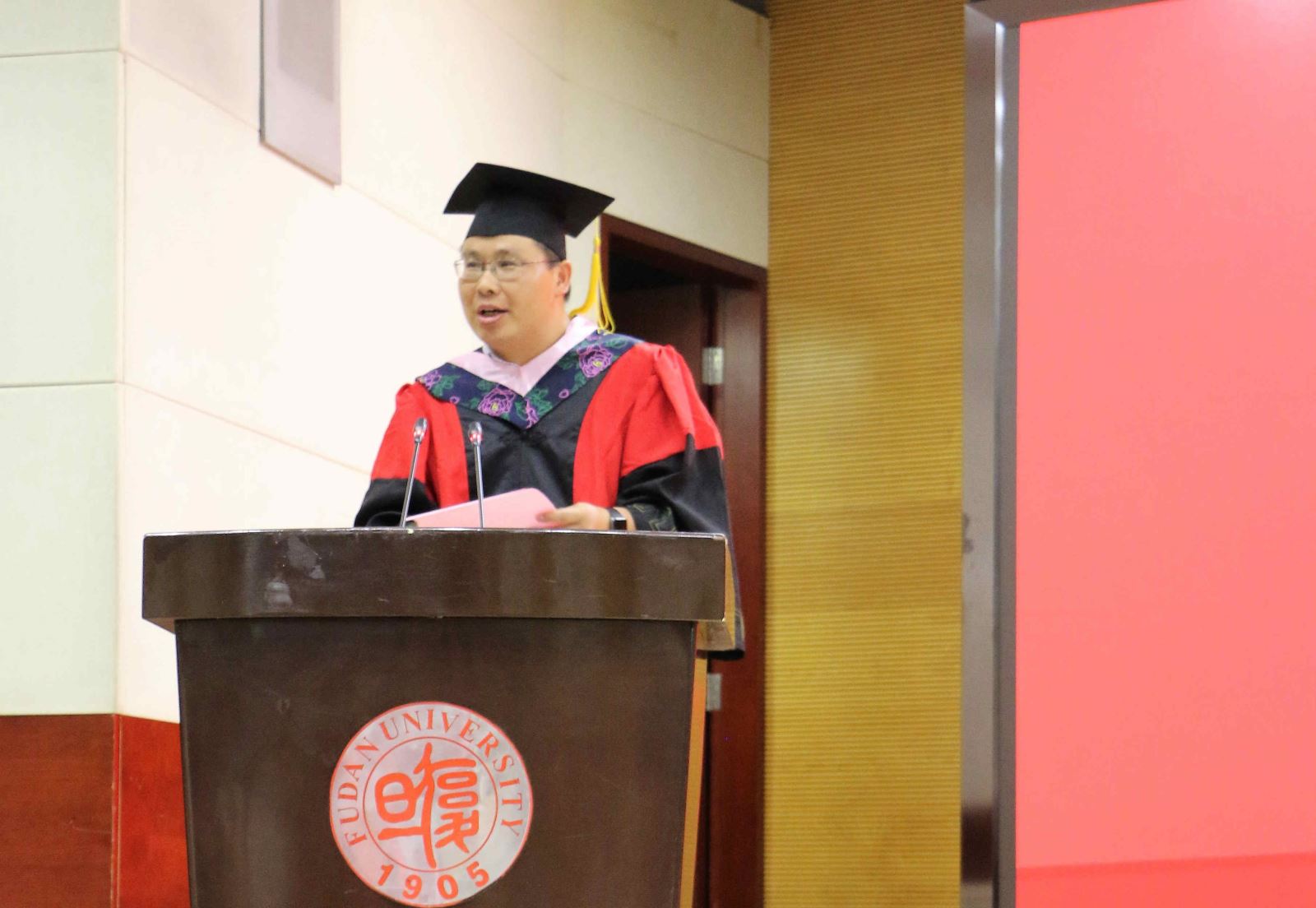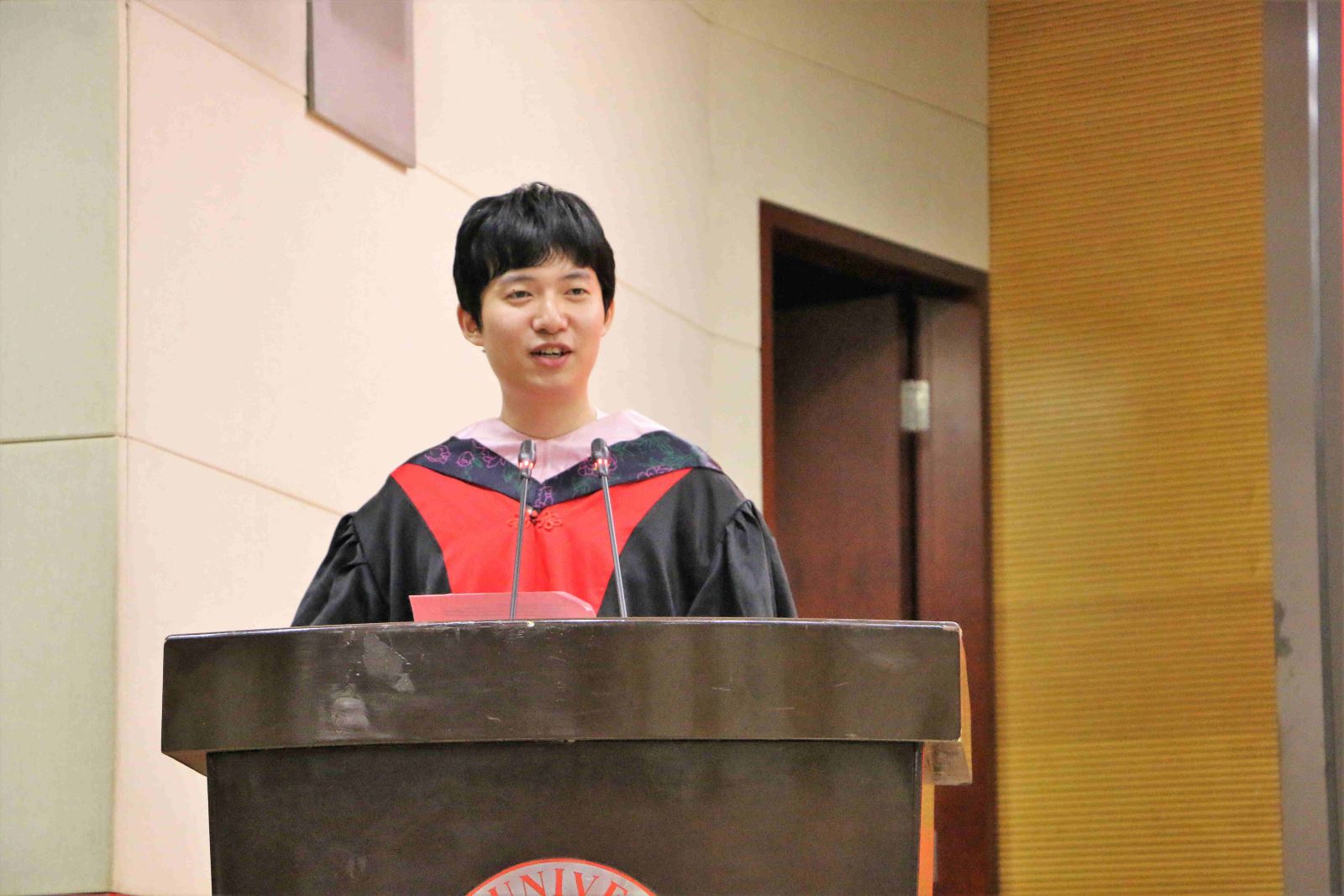 学位授予仪式上,英文系副系主任段枫老师、俄文系系主任姜宏老师、德文系李双志老师、法文系系主任袁莉老师、日文系系主任邹波老师、韩文系系主任黄贤玉老师、翻译系系主任汪洪章老师先后上台宣读毕业生名单。