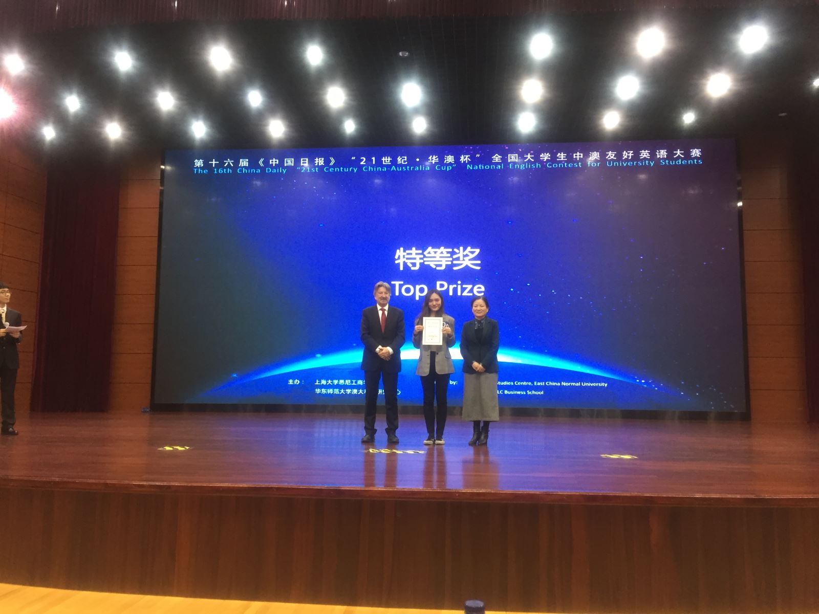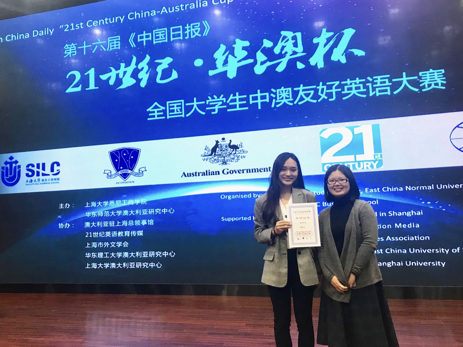 12月15日,第16届“21世纪·华澳杯”大学生中澳友好英语大赛在上海大学嘉定校区成功举办。来自上海、安徽、山东、江苏、浙江等省市27所高校的选手参加了本次角逐。最后,来自复旦大学的选手林曾汇(2018级英翻专业本科生)脱颖而出,夺得大赛特等奖的桂冠,指导老师冯予力获最佳指导教师奖。