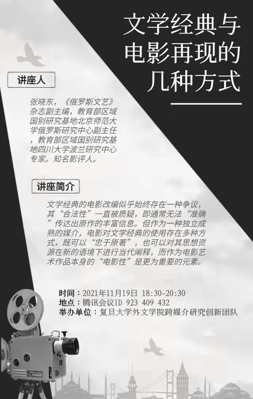 张晓东首先从传统概念上对文学和电影两种艺术形式的误读入手,提出文学和电影并无高低之分,只是不同的艺术形式和媒介形式: “如果说文学是时间的艺术,则电影是空间的艺术”。接着,他以大量经典影片为例证,分类阐述了文学银幕化的六种常见方式及其特征:第一,最理想的情况是,小说作者与电影作者是同一个人;第二,小说作者与电影作者关系密切,可以视为共同创作;第三,号称“忠实于原著”的改编;第四,宣称自己“不忠实”于原著的改编;第五,使用原著的名称和主题思想,但创造出新的意义的电影,艺术家的个性已经超越了原典的文本的内容;第六,程度不同地使用原著的主题、思想,创造出全新的作者电影。在阐述文学银幕化六种方式过程中,张晓东特别注重研究方法和研究视角,比如研究第一和第二种文学银幕化方式时,可以考察作者如何用不同媒介表达同一思想、情节等。研究第三和第四种文学银幕化方式时,不能简单地评价孰好孰坏,而应该考察语言转换中增添、删减、或改变了什么。