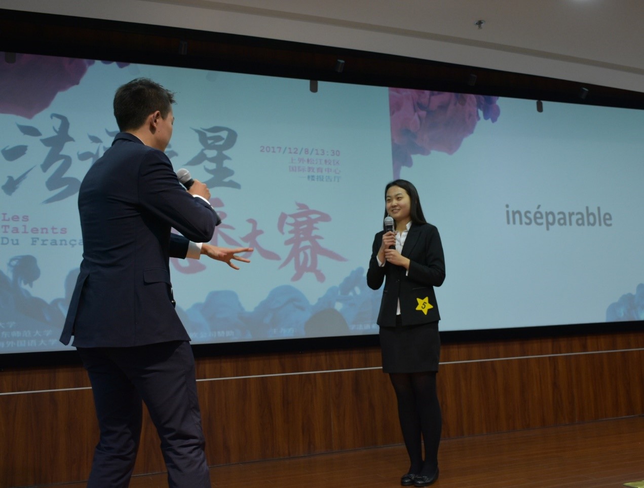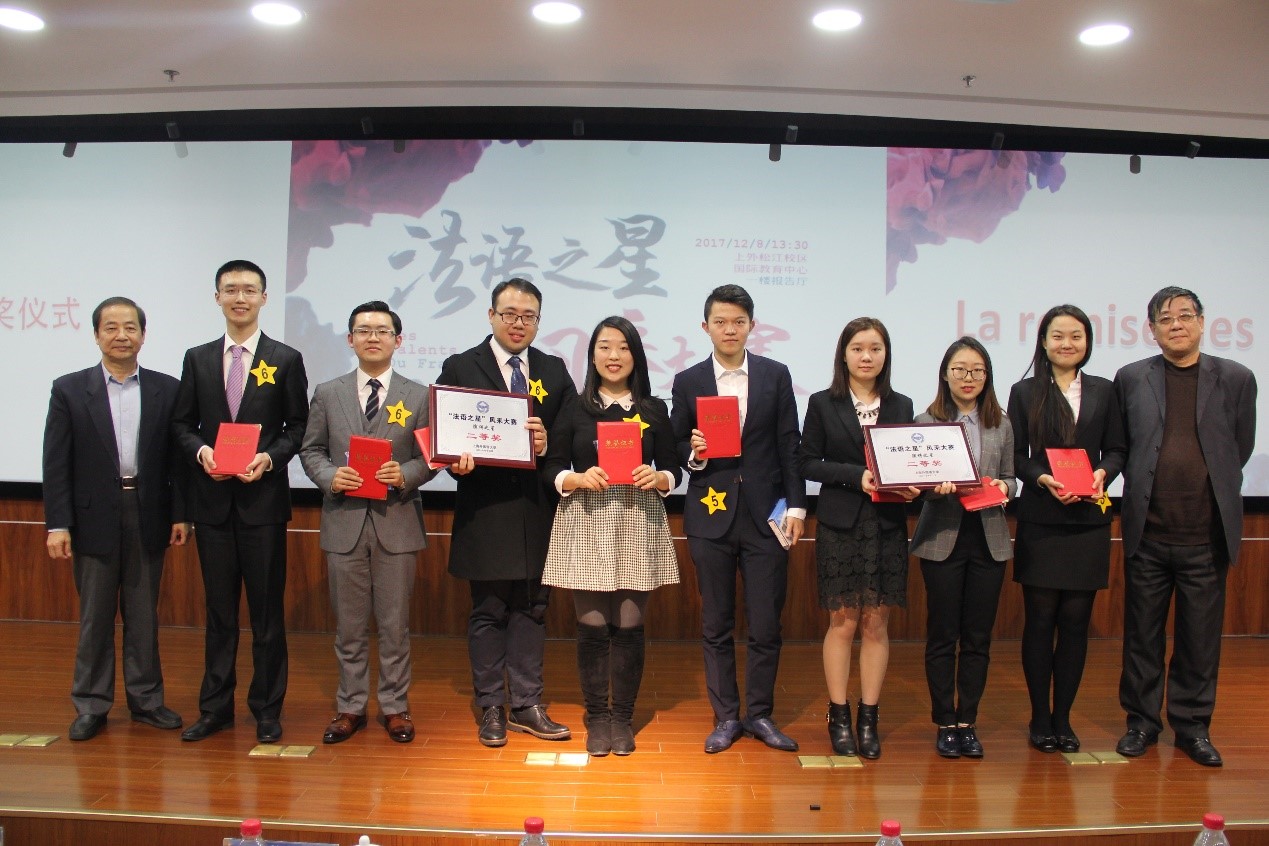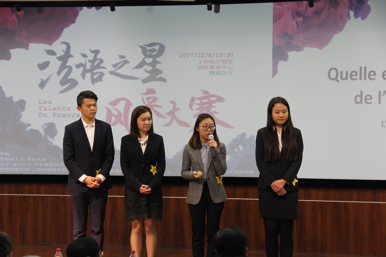 2017年12月8日下午,第九届全国“法语之星”风采大赛在上海外国语大学松江校区举行。经过一个下午的激烈角逐,复旦大学法文系三年级本科生郭竞雯、钟雨桐、李天欣、赵一源4名同学组成的代表队,在演讲环节取得第二名的佳绩,最终荣获“法语之星”风采大赛二等奖。
