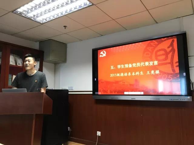 预备党员代表、2015级本科生 王奕骐 同学发言,他分享了自己加入党组织之后的成长和收获,他表示,在今后的学习和生活中,决心继续践行党员的责任和义务,实现和创造自我价值。