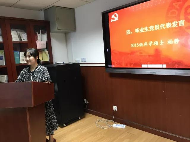 2018届毕业生党员代表、2015级硕士研究生 柏静 发言,她与大家分享了家乡的发展变化,她表示,通过加入党组织,个人收获了成长,对党员身份更加认同和自豪。毕业后,她将回到家乡成为一名高校辅导员,用自己学识和情怀来影响一代又一代的年轻人。