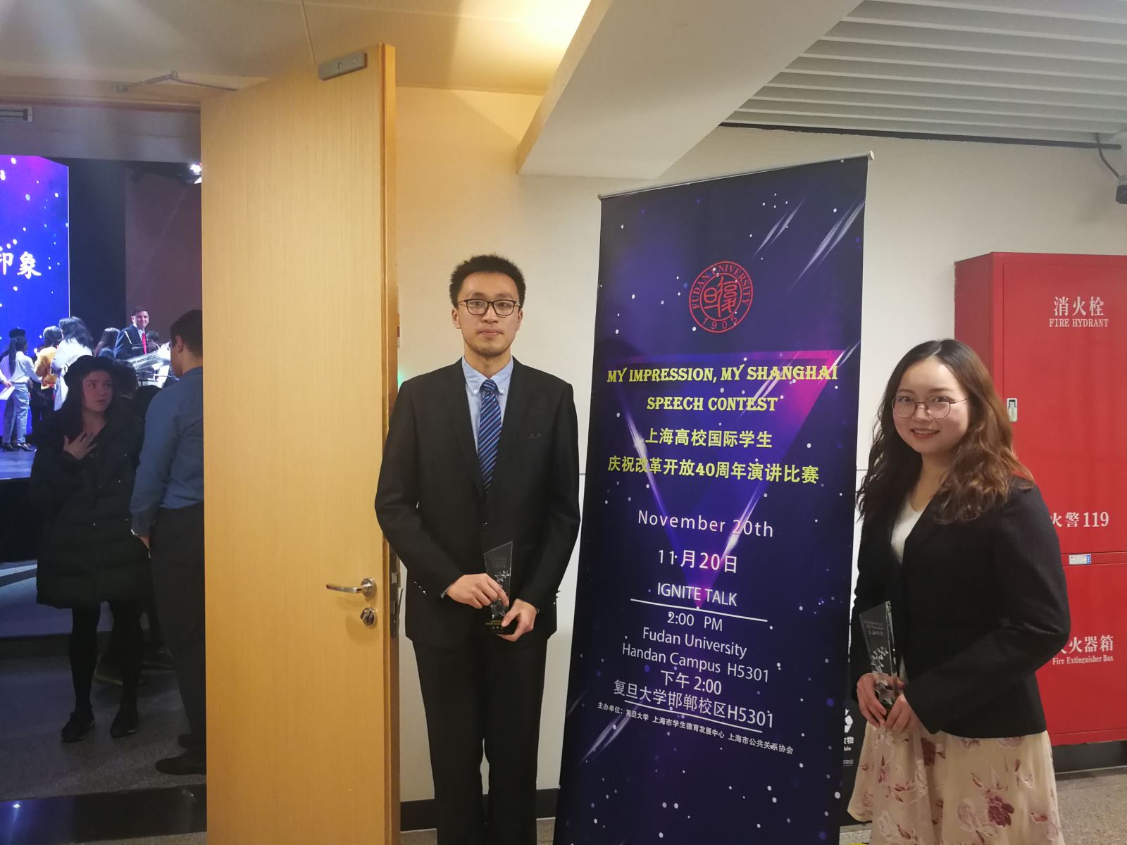 11月20日,“My Impression, My Shanghai 上海印象”上海高校国际学生庆祝改革开放40周年演讲比赛在复旦大学举行。来自外文学院的黄迎佳(英语系一年级)和熊志远(翻译系四年级)呈现了精彩的演讲,分获二等奖与三等奖的佳绩。