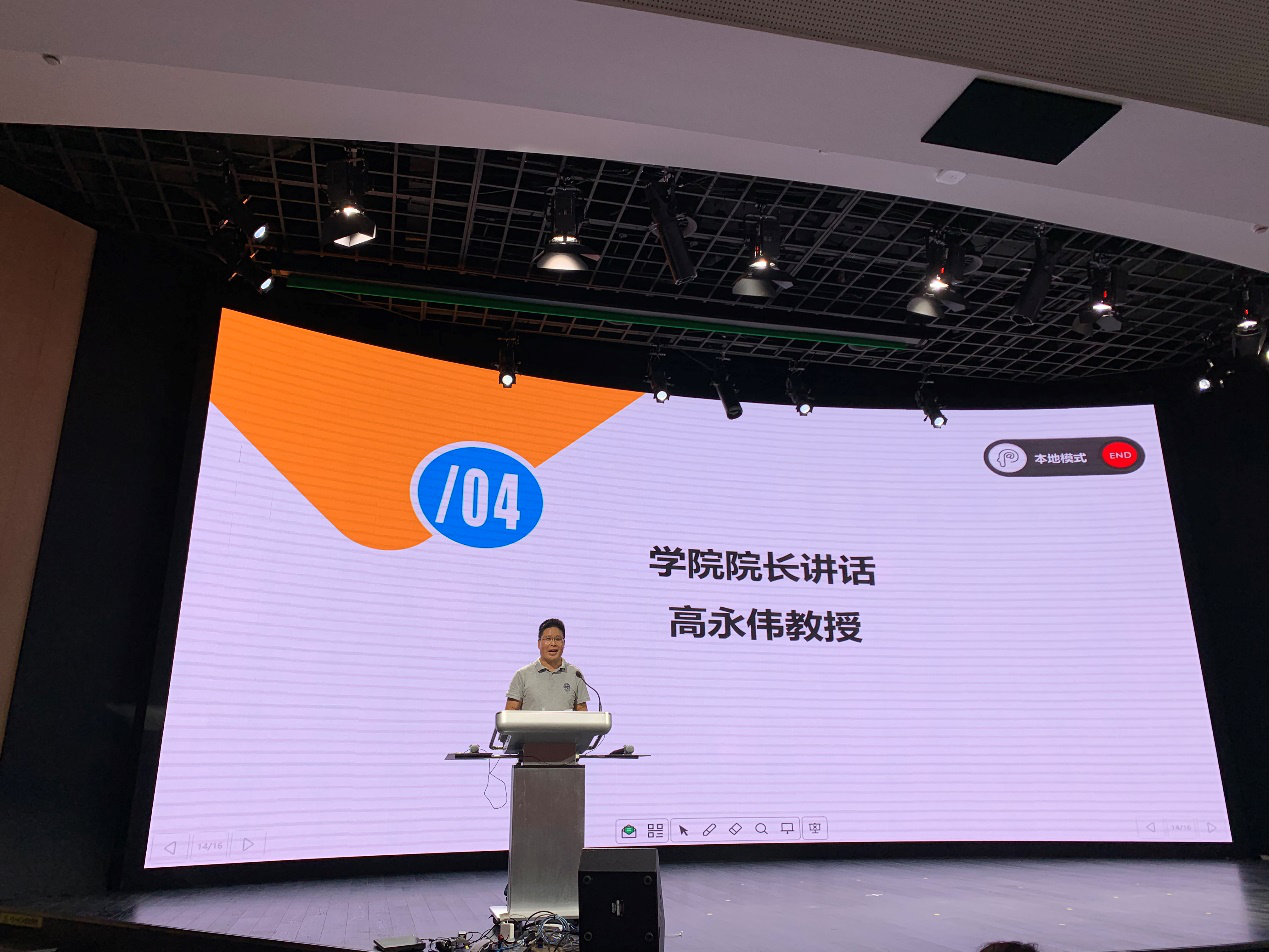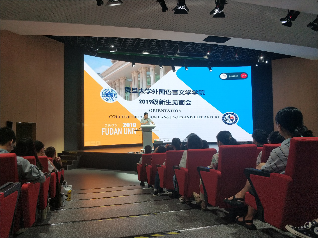 最后,高永伟院长讲话。高老师向新生们介绍了复旦外文学院这个“真正大家庭”的历史和基本情况。高老师表示,这次新生见面会是第一次在学校开学典礼之前举办的见面会,表达了老师们想与新同学们沟通交流的“迫切”心情,而2019级也成为了外文学院有史以来学生人数最多的一个年级。