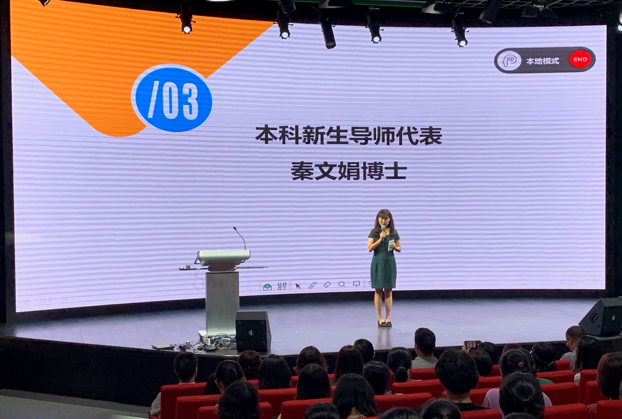 英文系秦文娟老师代表本科新生导师发言,她从自己也是一名“复旦新人”切入,用自己课堂上曾经提出的一个问题“something you really want to write about”,寄语新生要善于主动思考和选择。最后,她向大家提出三点建议: “选择”、“别拿别人的优秀去定义自己”、“合作”,并祝愿大家拥有一个有梦想、有规划、更有爱的大学生活。