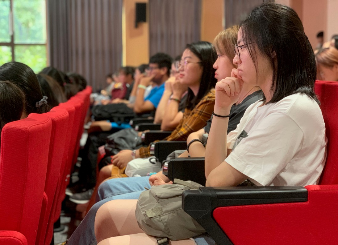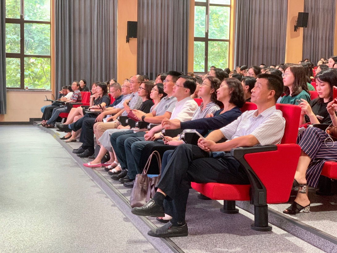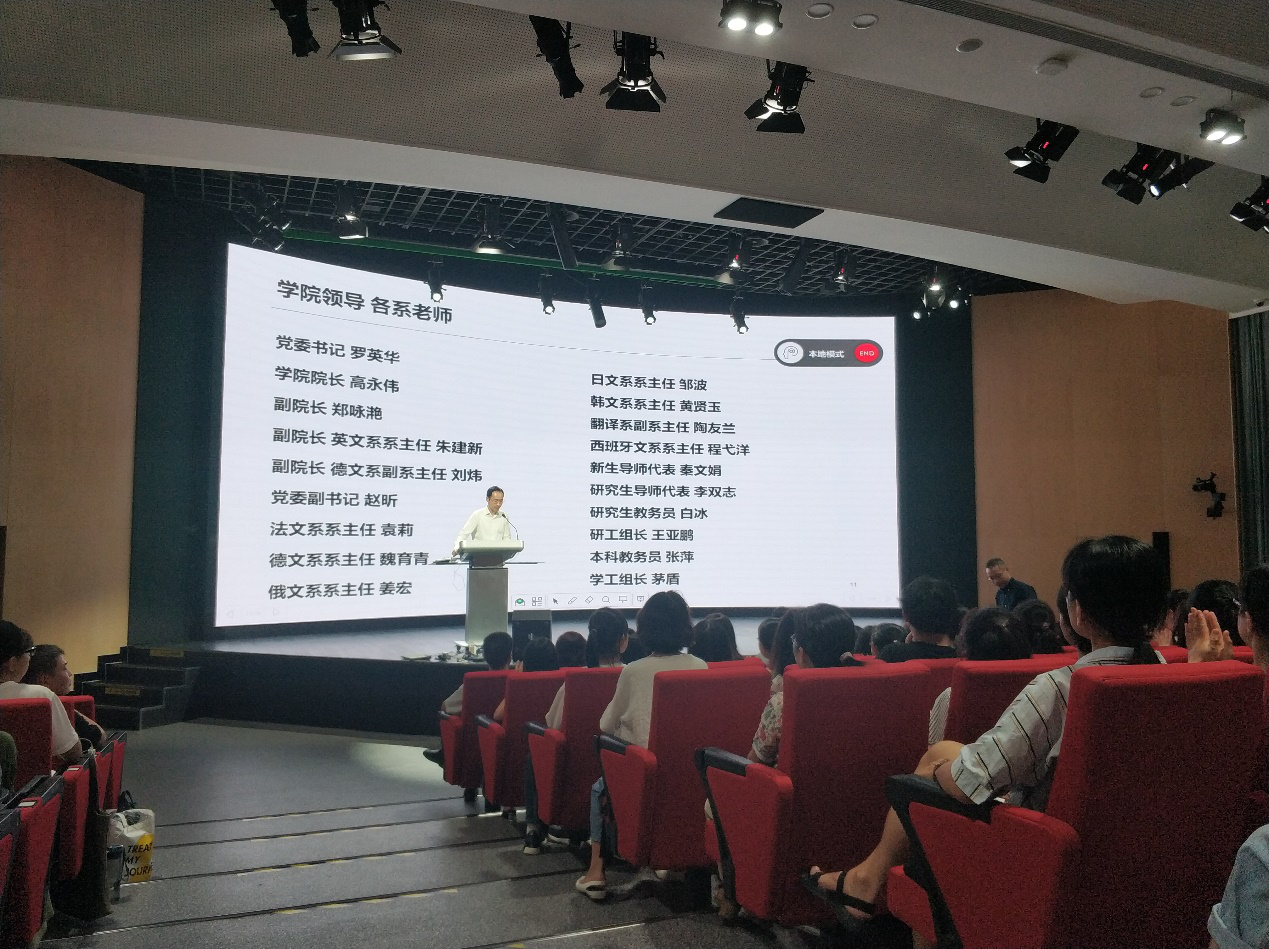 2019年9月5日下午,外文学院在5301报告厅举行2019级新生见面大会,学院党委书记罗英华、院长高永伟,院领导郑咏滟、朱建新、刘炜、赵昕,各系系主任、本科生导师代表、研究生导师代表、教务员、学工办负责人,全体2019级本硕博新生出席大会。