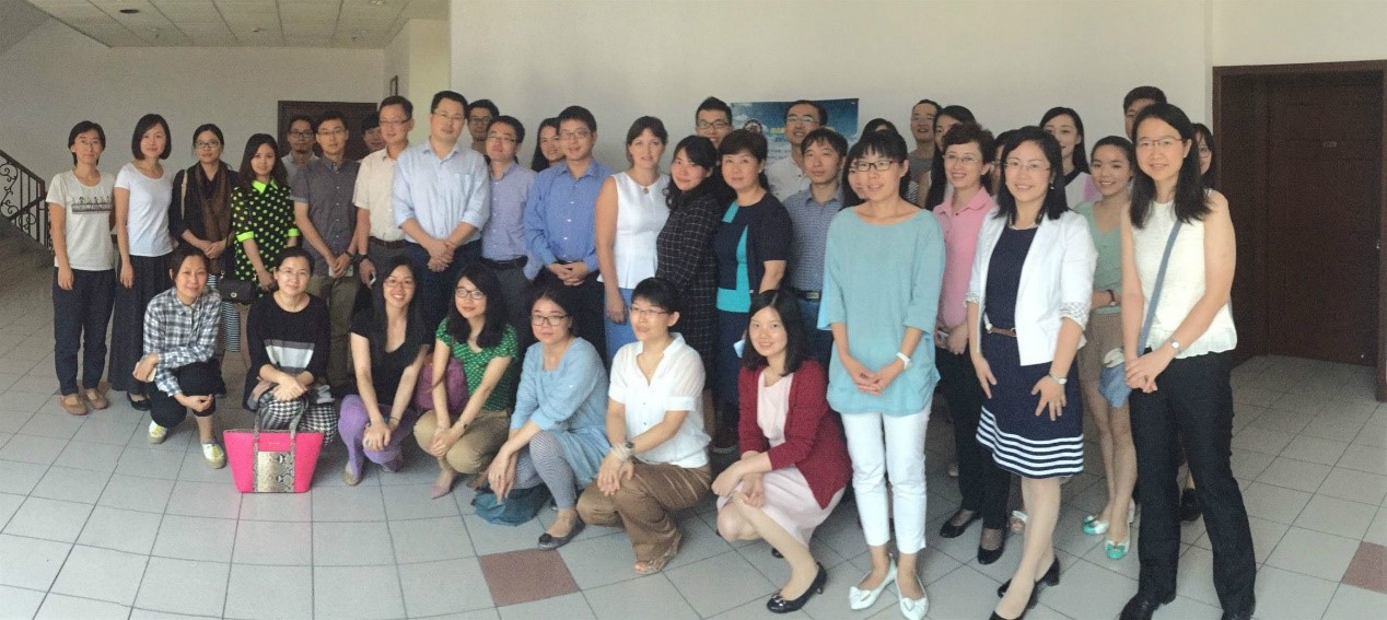 (从左至右依次为,排一:复旦大学外文学院院长曲卫国教授、上海外国语大学中国外语战略研究中心主任赵蓉晖教授、香港大学教育学院Mairin Hennebry博士;排二:复旦大学外文学院赵彦志、冯予力、张宁宁博士;排三:复旦大学外文学院范劲松博士、上海外国语大学中国外语战略研究中心沈琦教授、朱晔博士;排四:上海外国语大学中国外语战略研究中心余华博士、香港大学教育学院高雪松博士、复旦大学外文学院郑咏滟博士)