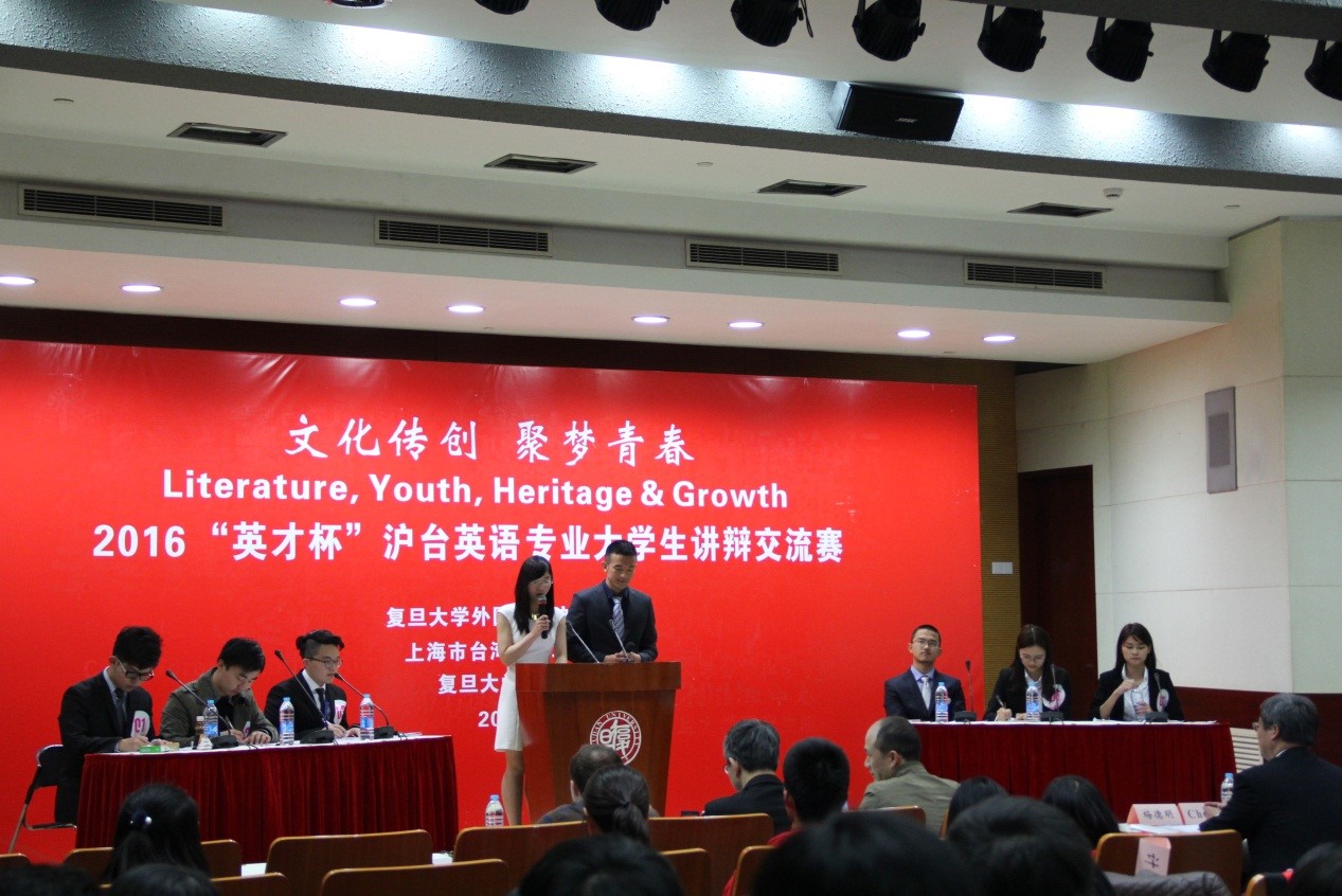 2016年3月31日至4月4日,首届“英才杯”沪台英语专业大学生讲辩交流赛于复旦大学举行,本次大赛主题为”Literature, Youth, Heritage and Growth”,由leyu乐鱼·官方web站登录入口、上海市台湾同胞联谊会、复旦大学出版社共同主办。来自复旦大学、上海交通大学、同济大学、华东师范大学、上海外国语大学及台湾大学、台湾政治大学、台湾师范大学、东吴大学等沪台两地九所高校的学子齐聚复旦,切磋技艺,沟通交流,增进感情。