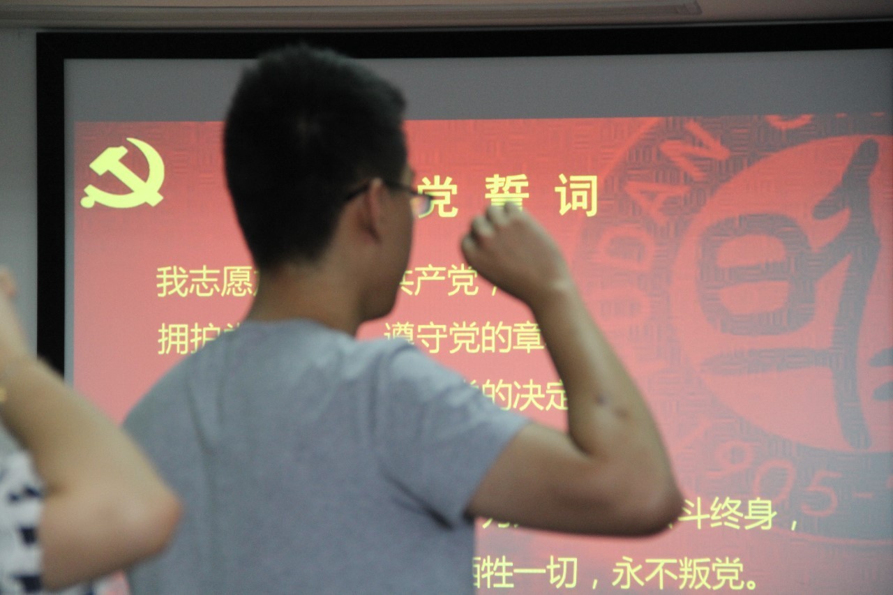 在学院党委副书记曾建彬老师的带领下,14名新发展的预备党员高举右拳,面向党旗庄严宣誓,其他师生党员也共同重温了入党誓词。