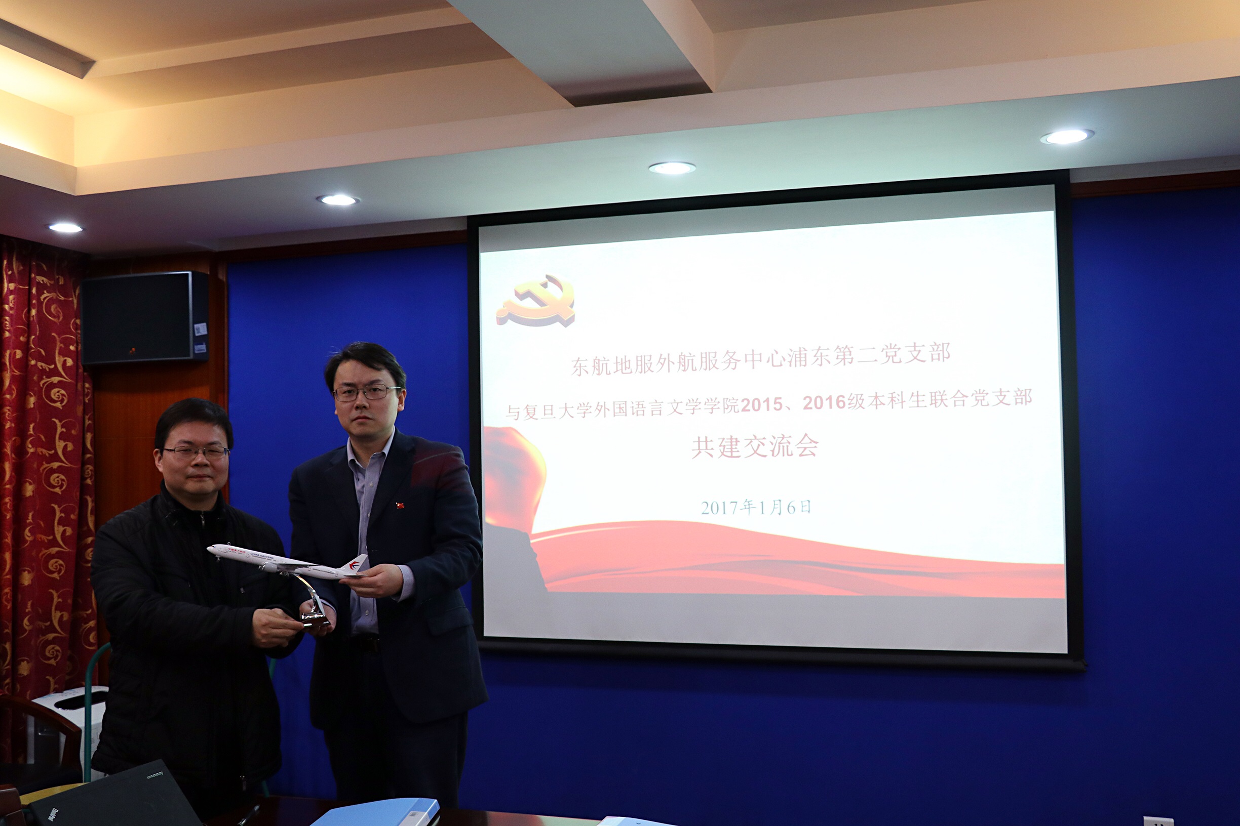 为进一步贯彻落实十八届六中全会精神,深化“两学一做”教育实践活动,增强党员学习意识和服务意识。1月6日上午,东航地面服务部外航服务中心浦东第二党支部与外文学院2015级、2016级本科生联合党支部共建交流会暨共建签约仪式在复旦大学文科楼220会议室举行。东航地面服务部外航服务中心党总支书记骆伟,外航服务中心浦东第二党支部书记管玉蓉,外文学院党委副书记赵昕,学生党总支副书记郑阳、王亚鹏,以及双方党员代表参加活动。