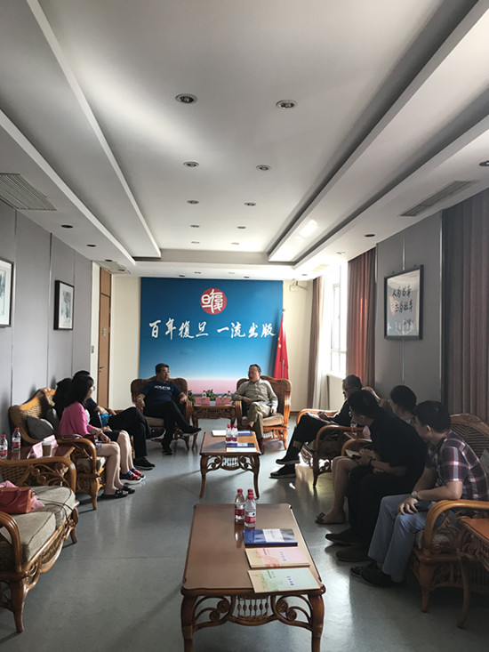 中国外文局翻译专业资格考评中心代主任王继雨(左一)在复旦大学出版社进行调研